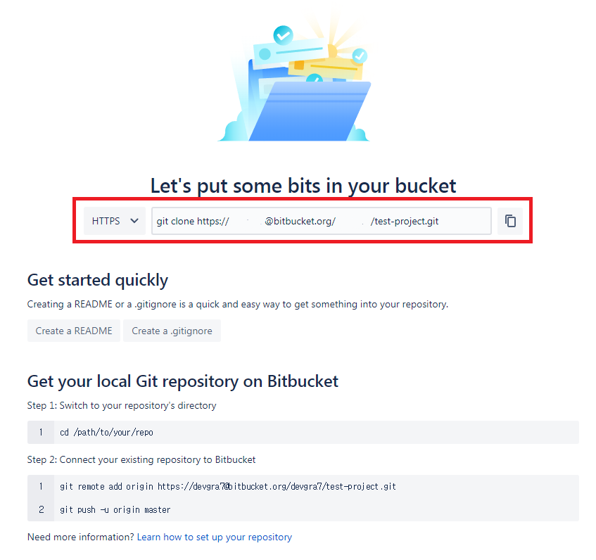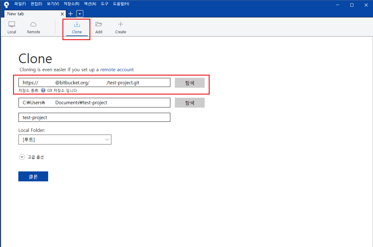 클론 버튼을 누르면 Bitbucket에 만든 저장소와 위에 설정한 사용자의 컴퓨터의 목적지 경로 폴더와 연결이 됩니다.