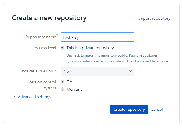 Bitbucket 은 소스트리 설치 시 가입을 했으니 가입한 아이디를 사용해서 새로운 리포지트리를 만들어 줍니다.