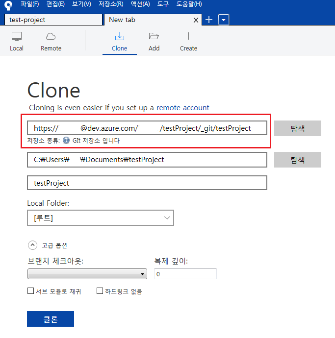 이제 소스트리와 Azure Repos 에 만든 저장소가 연결이 되었습니다.