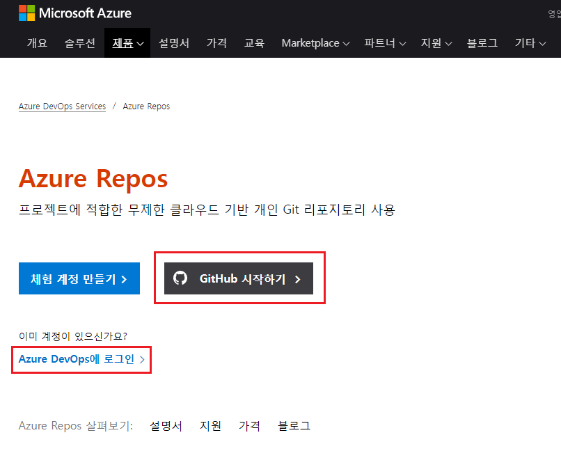 Azure Repos 는 마이크로소프트에서 서비스하는 Git 리포지토리로 기존에 마이크로소프트 아이디가 있으면 별도의 가입 없이 사용 가능합니다.