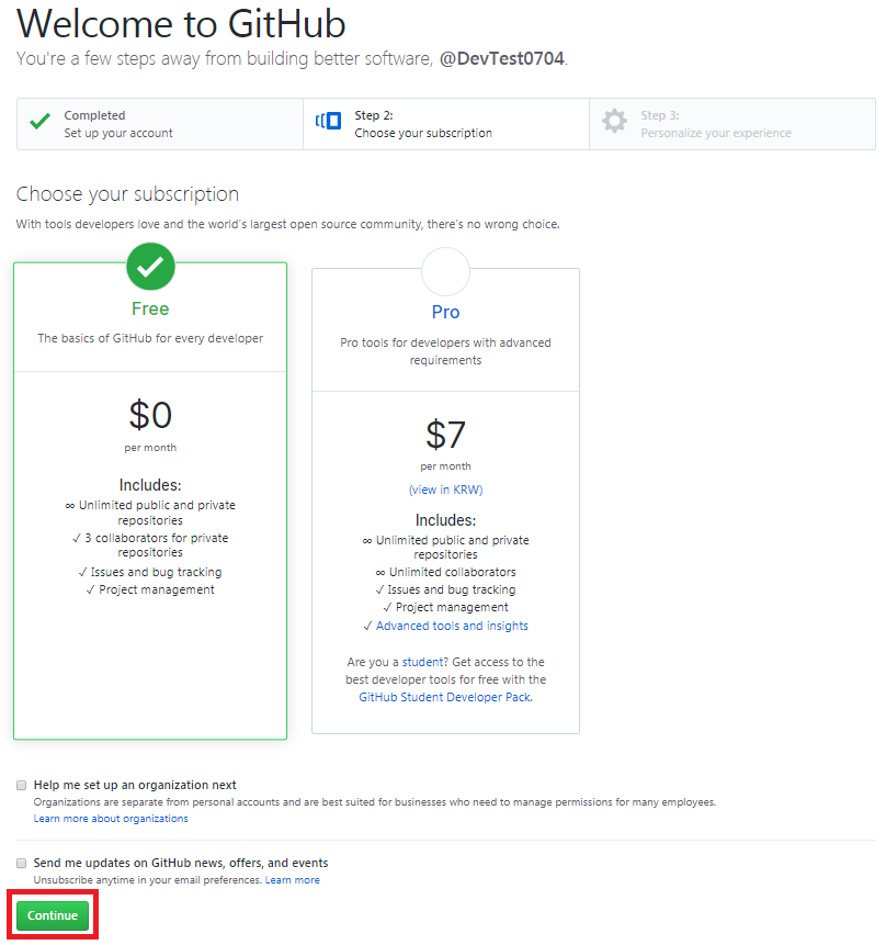 무료(free) 를 선택한 후 하단에 Continue를 선택합니다.
