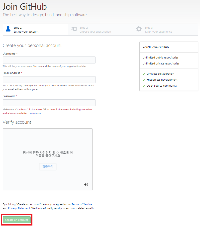 사용할 이름, 이메일 주소, 암호를 입력하고 확인용 퍼즐을 완성 한 뒤 하단에 Create an account를 클릭합니다.