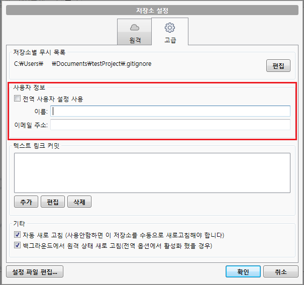 저장소 설정을 보면 사용자 정보가 기본적으로 입력되 있고 전역 사용자 설정 사용이 체크되어 있을 겁니다.