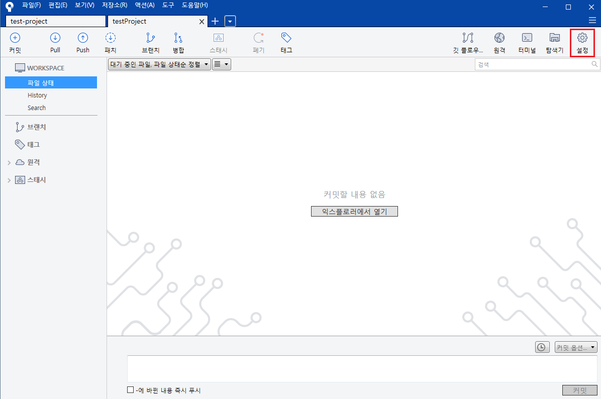 오른쪽 상단에 설정을 눌러 저장소 설정 옵션 창을 열어줍니다.