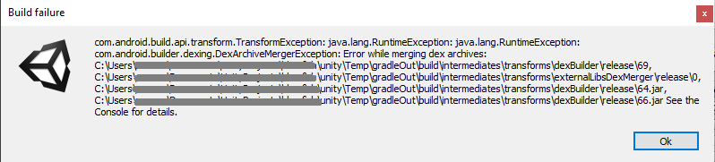 [Unity] Gradle build failed 오류 대응 - DexArchiveMergerException