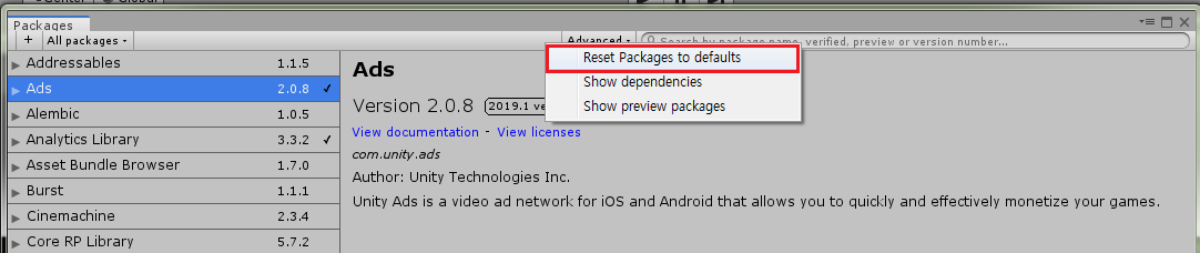 Advenced -> Reset Packages to defaults 를 사용해 초기화를 할 수 있습니다.