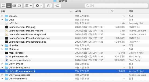 생성된 폴드에 가서 위 스샷에서 표시된 Unity-iPhone.xcodeproj 를 열어줍니다.