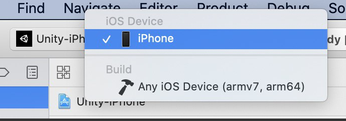 아이폰을 연결하면 Xcode 상단에 Unity-iPhone > 에서 연결한 iPhone을 선택해 줍니다.