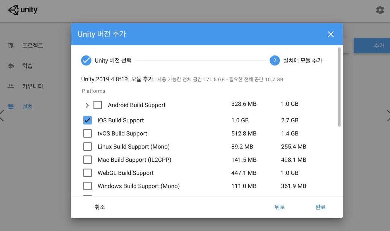 iOS니까 iOS Build Support를 선택해서 같이 설치합니다.