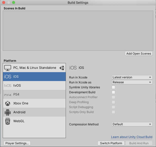 먼저 유니티를 실행 후 프로젝트를 열고 File -> Build Settings 에서 플렛폼을 iOS로 변경해 줍니다.
