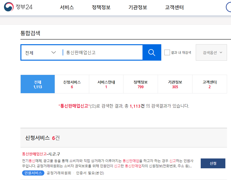 정부 24 사이트에서 통신판매업신고를 검색합니다.