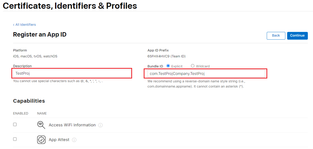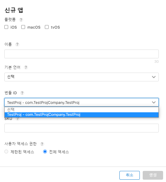 이제 번들 ID에서 위에서 만든 ID를 선택 할 수 있게됩니다.