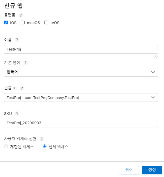 5. SKU : 앱 고유 ID로 편하게 자신이 알아볼수 있는 ID를 입력합니다. 저는 보통 프로젝트 명과 날짜를 입력합니다. (TestProj_20200903 이런식으로요.)