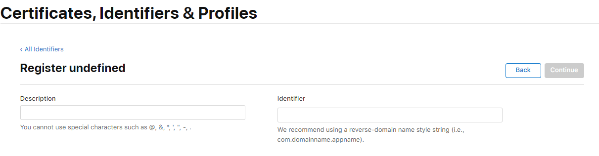 인증서, 식별자 및 프로파일 을 누르면 위 스샷과 같은 화면이 나오는데 여기에서는 Identifier 부분이 입력이 안됩니다.