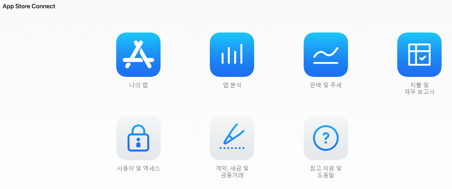 일단은 신규 앱 등록을 하기 위해서 오른쪽에 있는 App Store Connect 를 선택합니다.