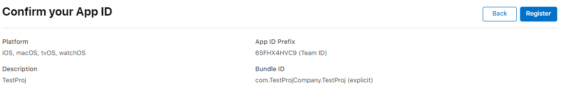확인 후 Register 를 누르면 App ID가 생성됩니다.