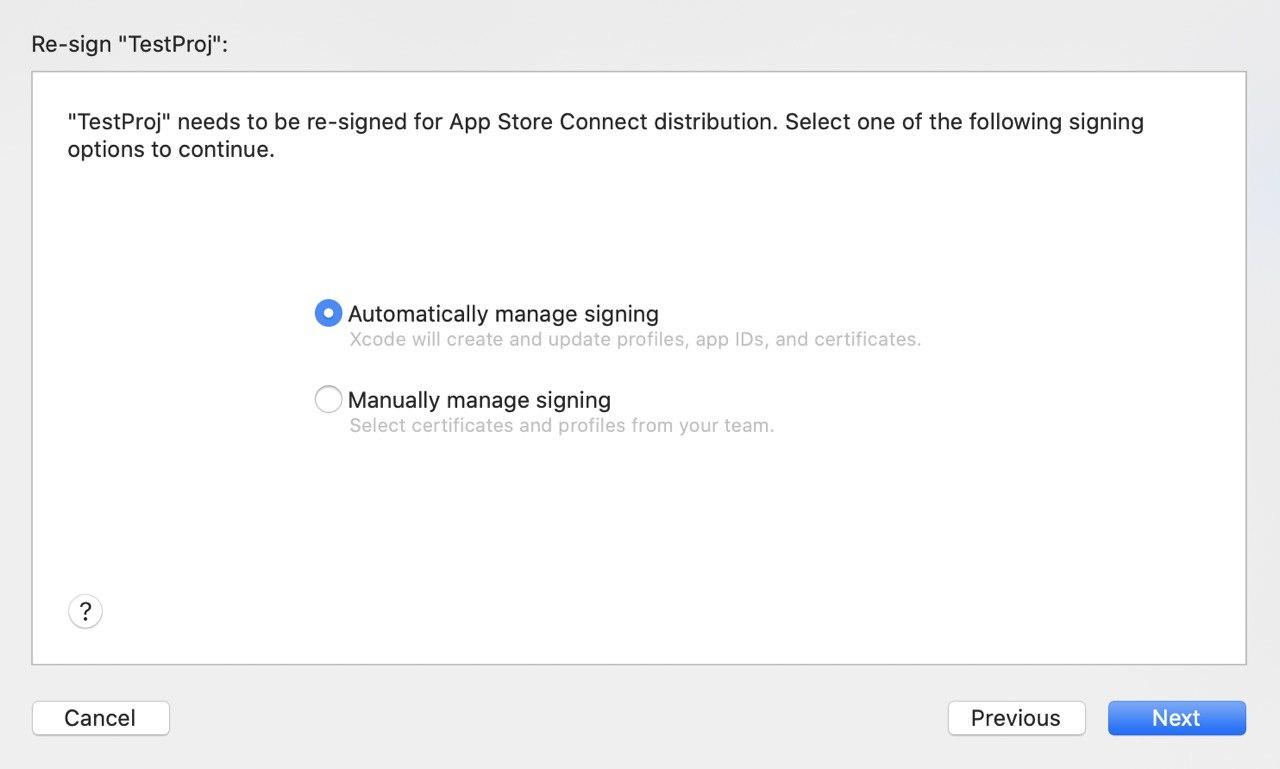 위 설정이 완료되어 있다면 Automatically manage signing 을 선택 후 Next를 선택합니다.