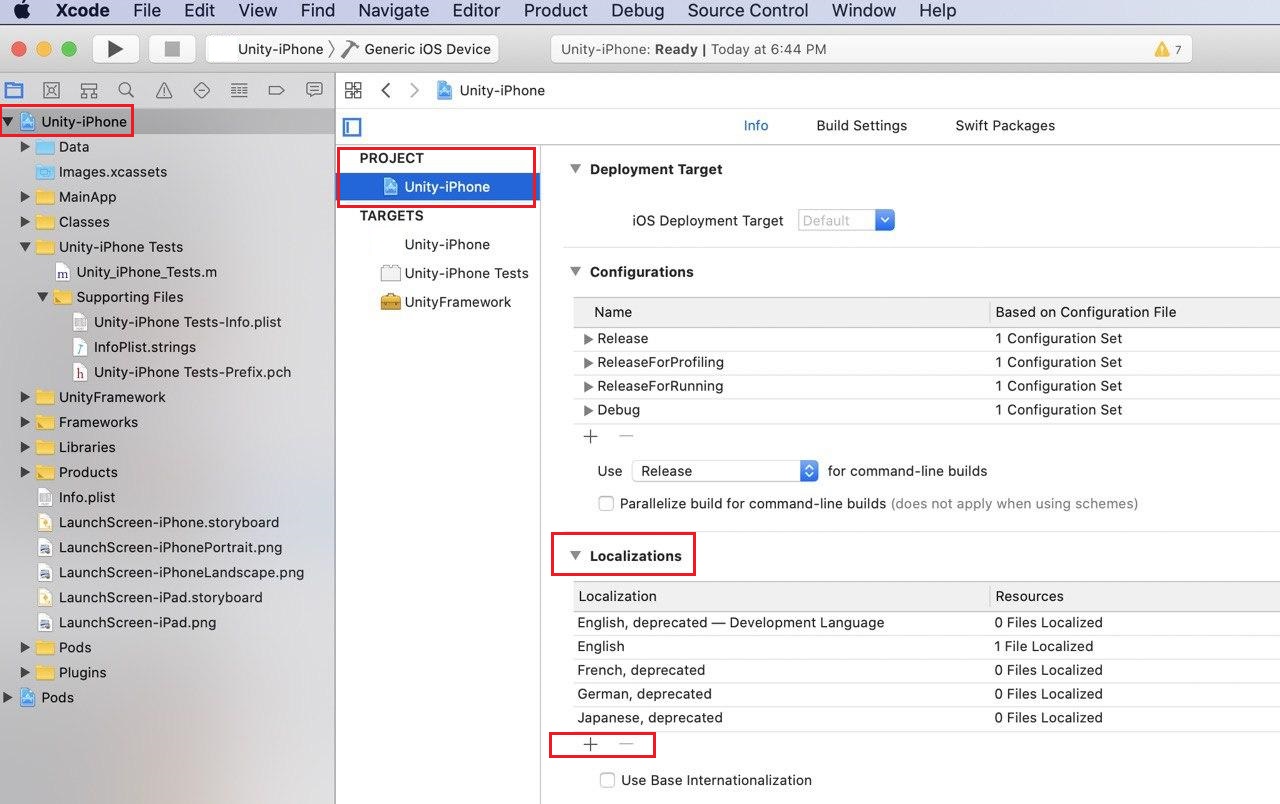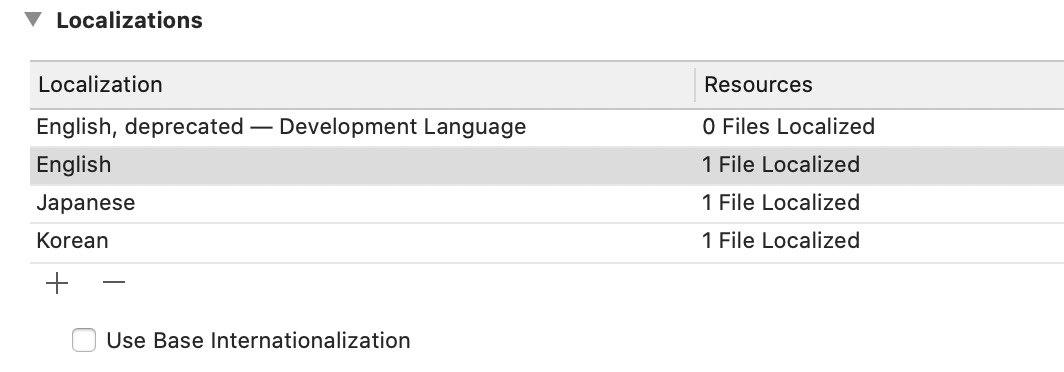 Localizations 에서 하단의 + - 버튼으로 필요없는 언어는 삭제하고 지원할 언어를 추가해 줍니다.