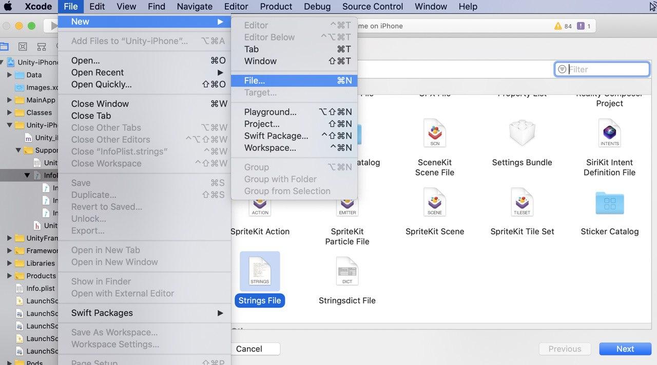 혹시나 xCode나 유니티의 버전이 달라서 InfoPlist.strings 가 없는 경우에는 파일을 새로 생성해서 하면 됩니다.