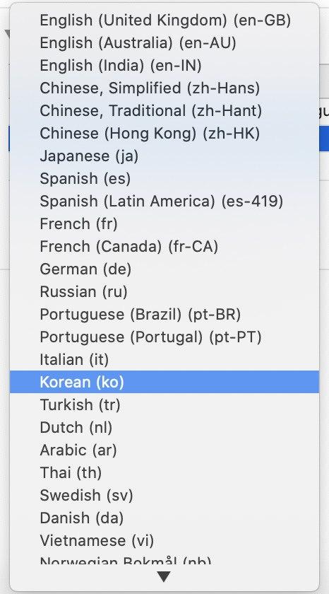 아래 스샷과 같이 빌드한 프로젝트를 선택하고 오른쪽에 PROJECT > Localizations 를 확인합니다.