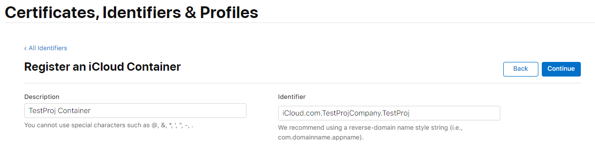 Description 과 Identifier 입력 후 Continue. Identifier는 번들ID를 입력해 주면됩니다.