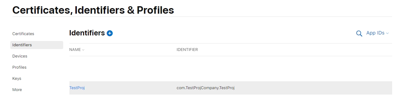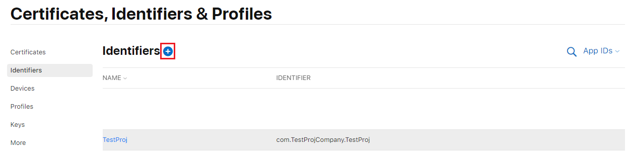 애플 개발자 페이지에 접속해서 Certificates, Identifiers & Profiles 에 Identifiers 오른쪽에 + 버튼을 눌러줍니다.