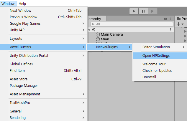 먼저 Cross Platform Native Plugins 임포트 하고 Window > Voxel Busters > Native Plugins > Open NPSettings 를 선택합니다.